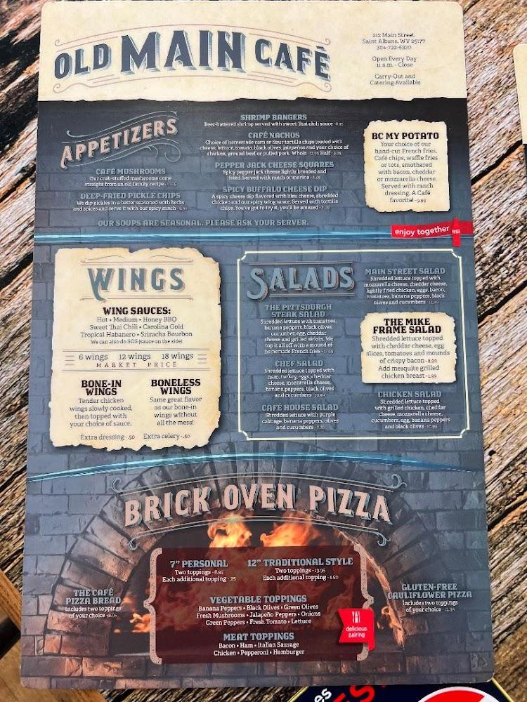 Discover Old Main Cafe, a beloved local establishment in St Albans, WV, where community and flavor blend effortlessly. Enjoy a welcoming atmosphere paired with a diverse menu featuring signature salads, hand-cut fries, mouthwatering brick oven pizza, and the Valley’s best wings. With attentive service and homemade dressings, every meal promises satisfaction. Catering to families and solo diners alike, the cafe offers takeout, dine-in, and delivery options. Revel in excellent cocktails, a wide selection of local beers, and daily specials that keep guests returning for more. Join us at 212 Main St and experience your new favorite dining spot!